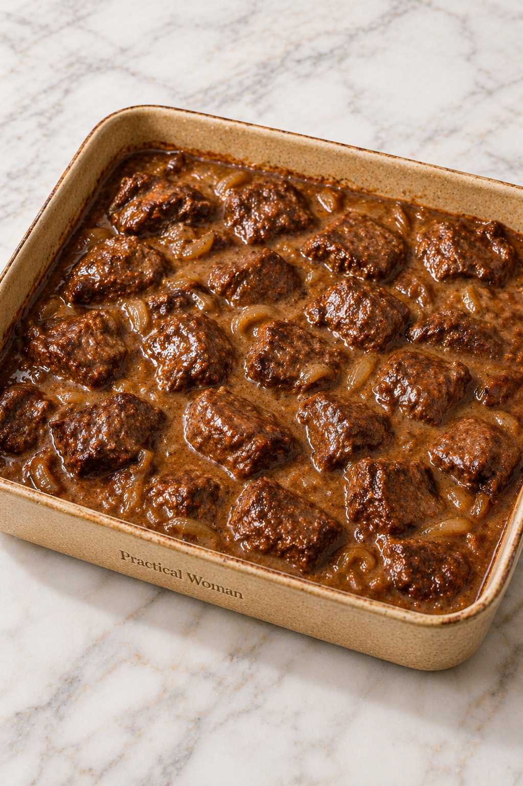 The beef turns incredibly tender, soaking up the rich, savory onion gravy as it slowly bakes. Each bite is deeply comforting with melt-apart texture and a bold, hearty flavor.