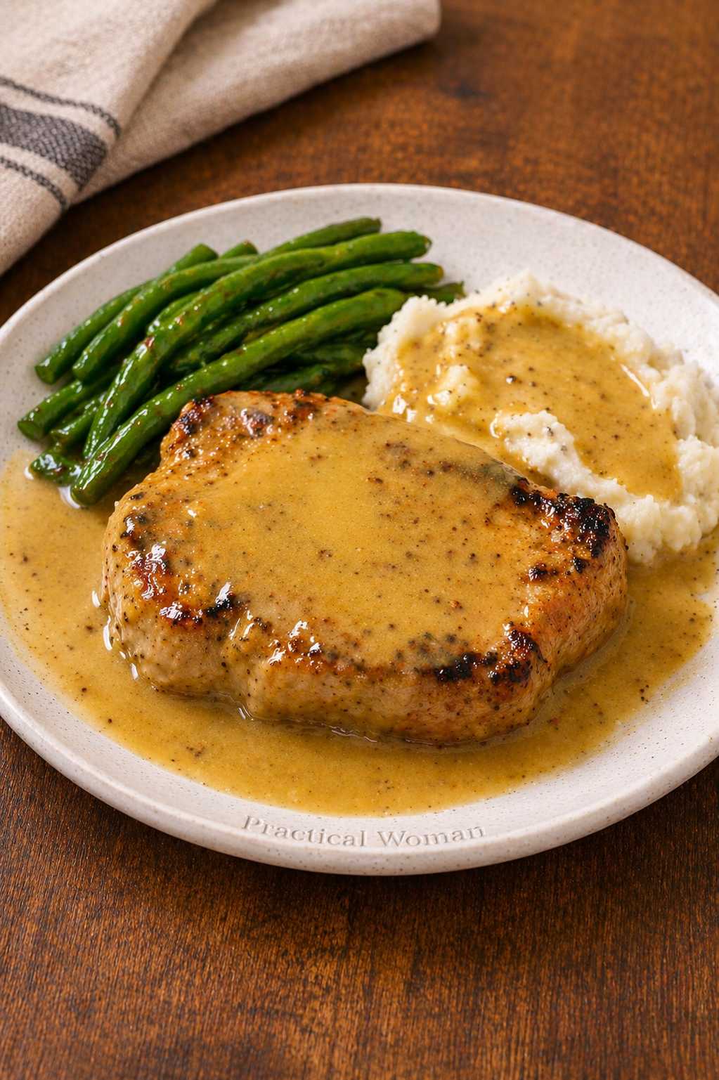 Remove pork chops carefully, stir the sauce, then return pork or spoon sauce over each portion.