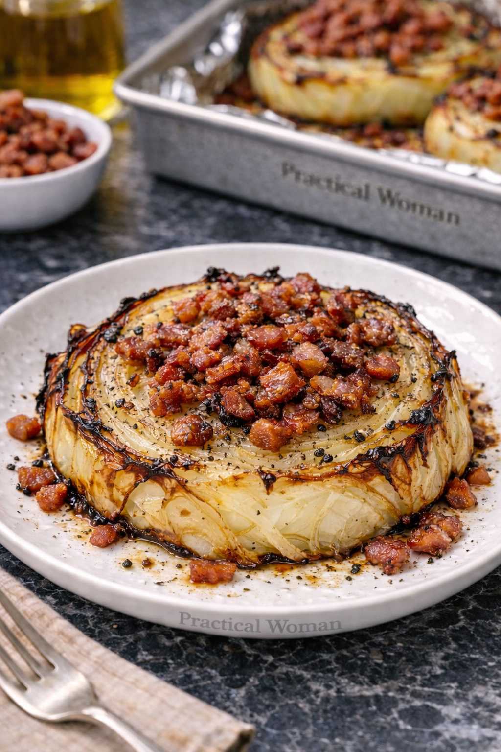 Place cabbage steaks in a single layer on the same baking sheet over the bacon drippings. Use a second sheet if needed to avoid crowding.