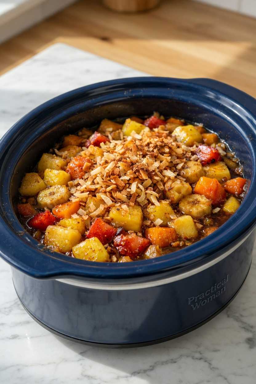 4-Ingredient Slow Cooker Tropical Fruit Bake Ingredients: