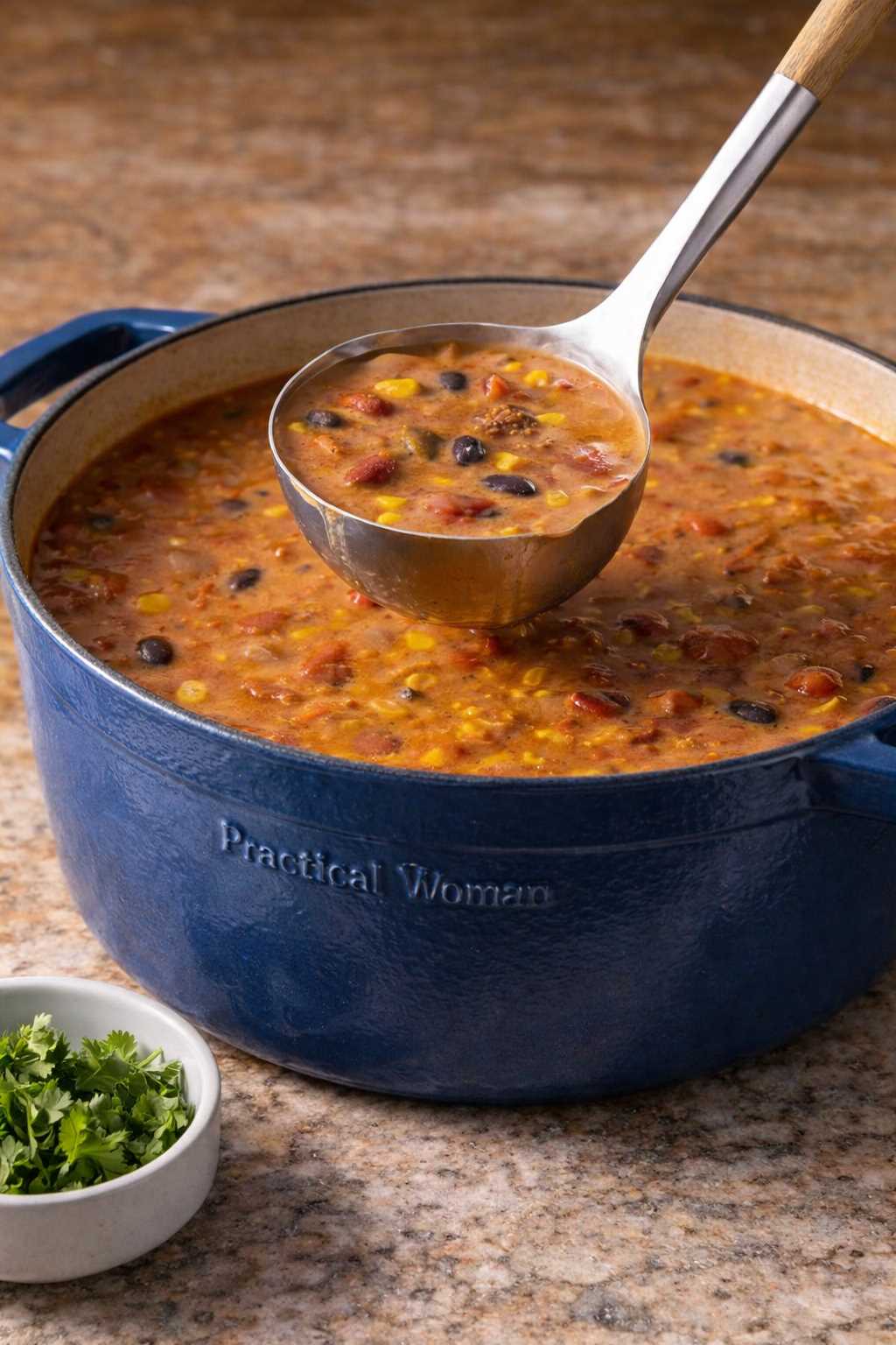 Add the turkey chili, black beans, kidney beans, pinto beans, diced tomatoes, corn, and tomatoes with green chiles to a large 6-quart pot.