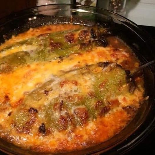 Cover the cheese-stuffed peppers in the pan with the rest of the sauce and cheese.