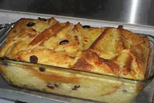 Pour the pudding mixture over the bread in the pan and let it rest for 30 minutes.