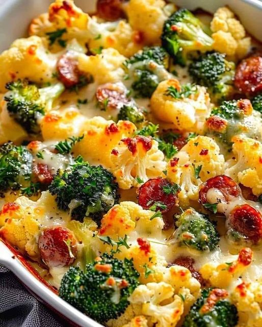 - Transfer drained broccoli, cauliflower, and sausage mixture to the prepared baking dish.