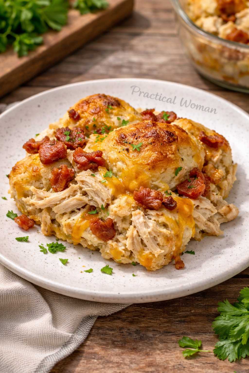 Bake uncovered for 30 minutes at 350°F (175°C) until biscuits are fully cooked, the top is golden brown, and cheese is melted.