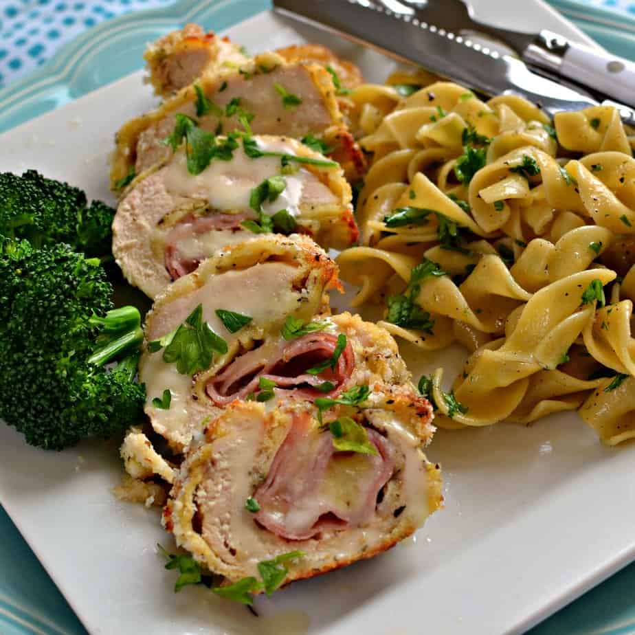 Place one piece of Swiss cheese on each piece of chicken. Top with a piece of ham on each piece of Swiss cheese. Roll up chicken breasts and secure them with a toothpick.