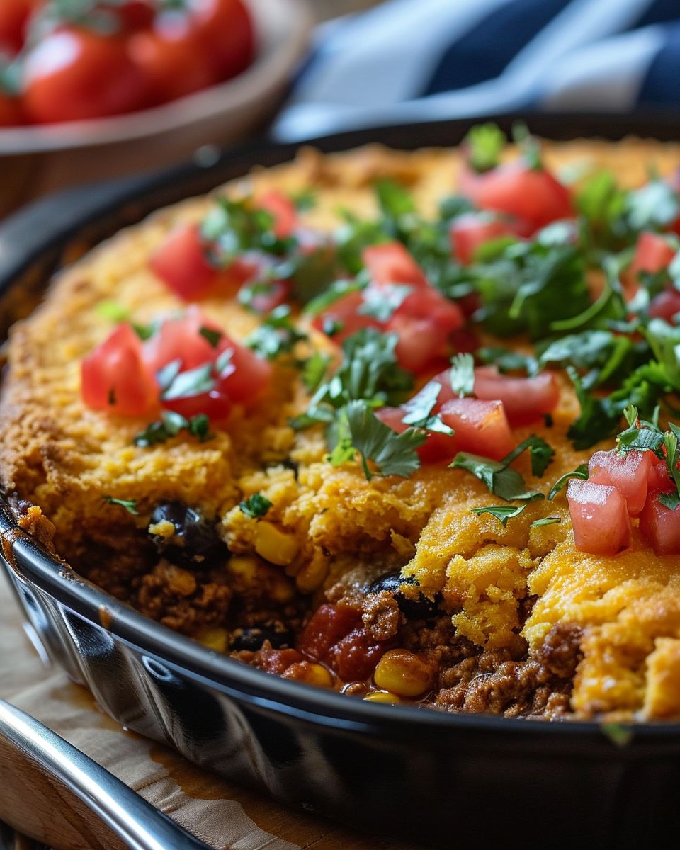 - Bake in the preheated oven for 20-25 minutes, or until the cornbread topping is golden brown and a toothpick inserted into the center comes out clean.