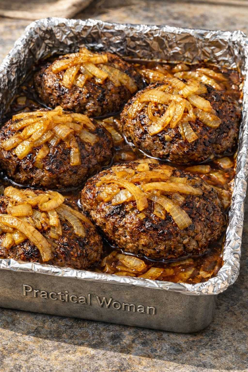 Deeply savory beef with sweet, caramelized onions melting over the top makes every bite rich and satisfying. The pan juices create a glossy finish that feels comforting and hearty. Perfect served straight from the dish for a warm, satisfying dinner moment.