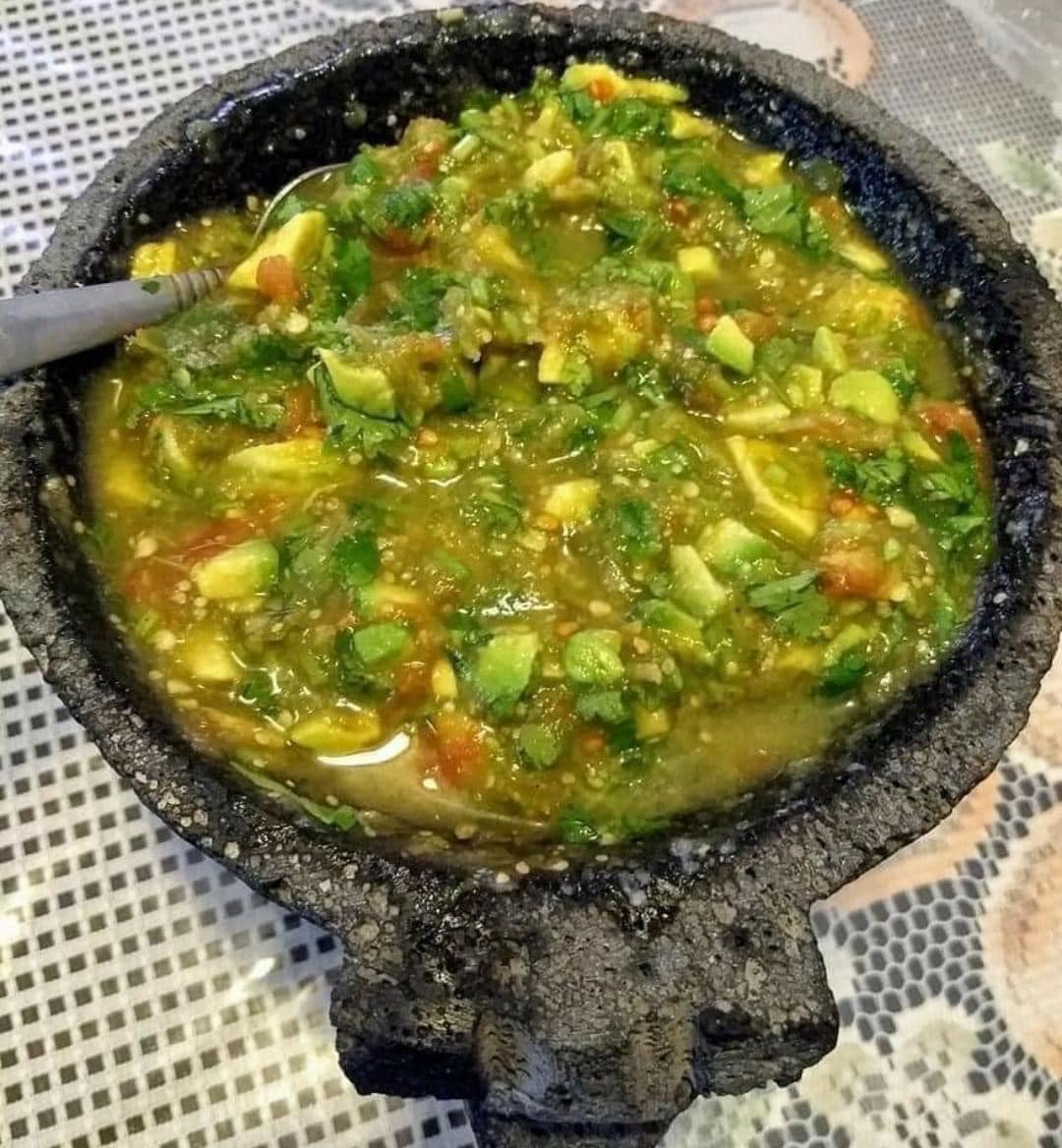 I cooked five green tomatoes and one red tomato, three serrano chiles, when they were well cooked I put a piece of onion, garlic and salt in the molcajete and began to molcajete, then I added the chiles, and molcajetie, then the tomatoes and finally the tomato, add a few sprigs of chopped cilantro and an avocado.