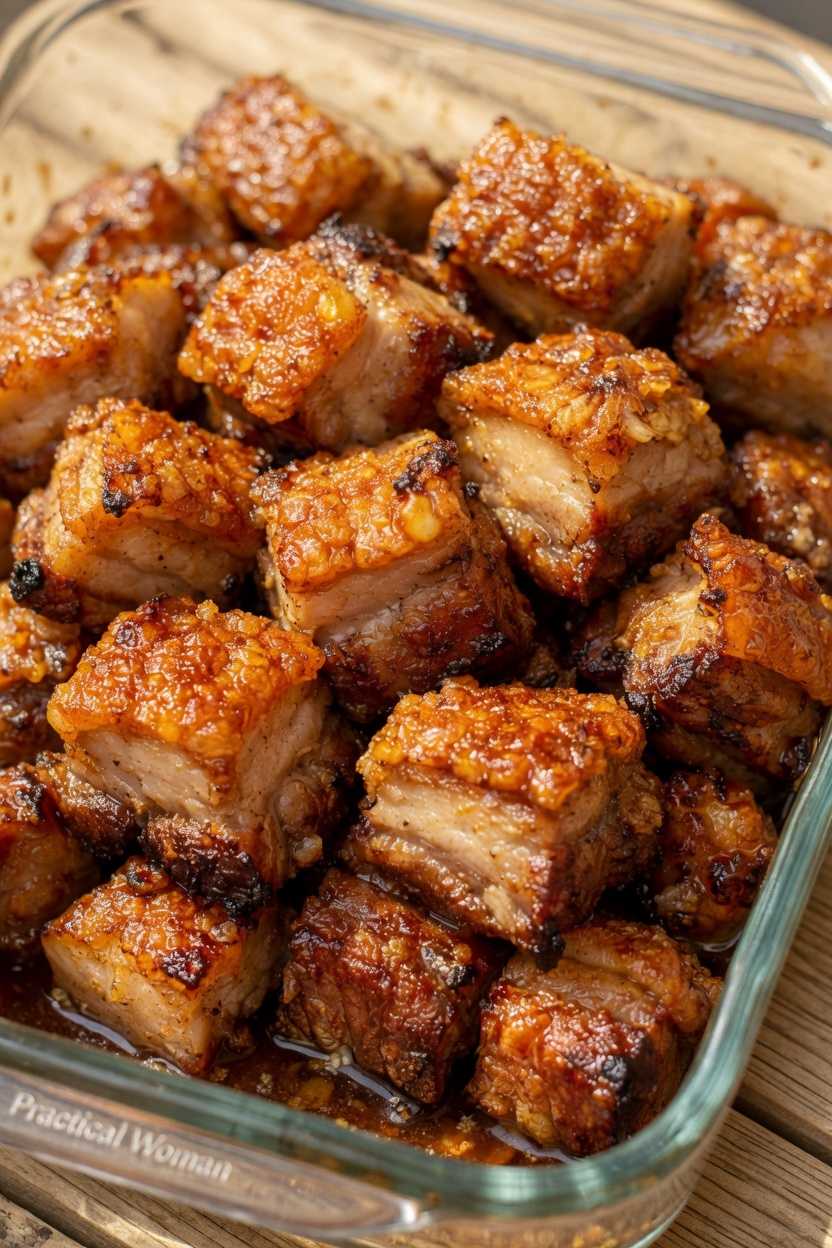 These pork bites come out intensely savory with a shatter-crisp top and rich, juicy center. The contrast between the crackling skin and tender meat makes them especially satisfying straight from the oven.