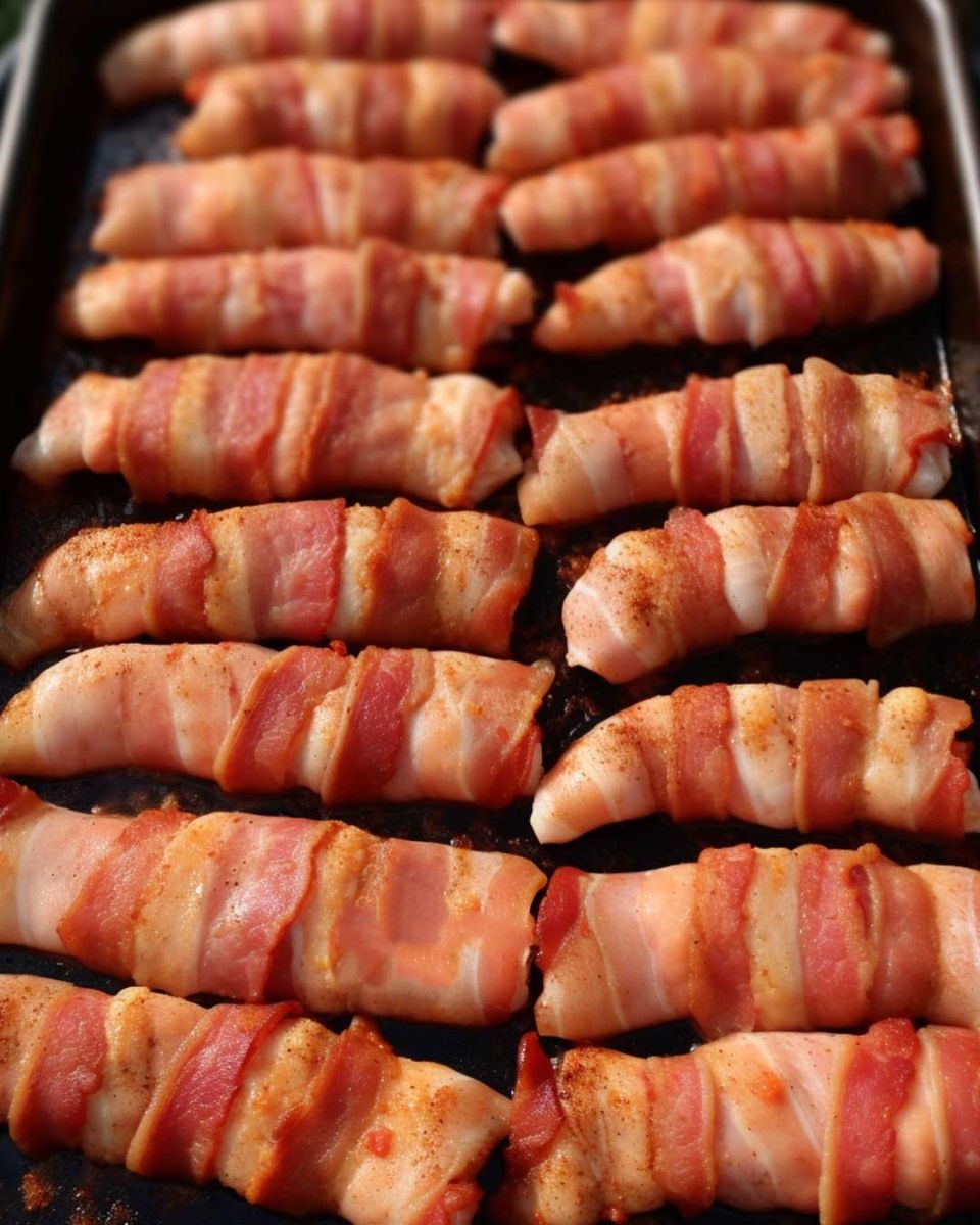 Place seasoned and bacon-wrapped chicken on the smoker.