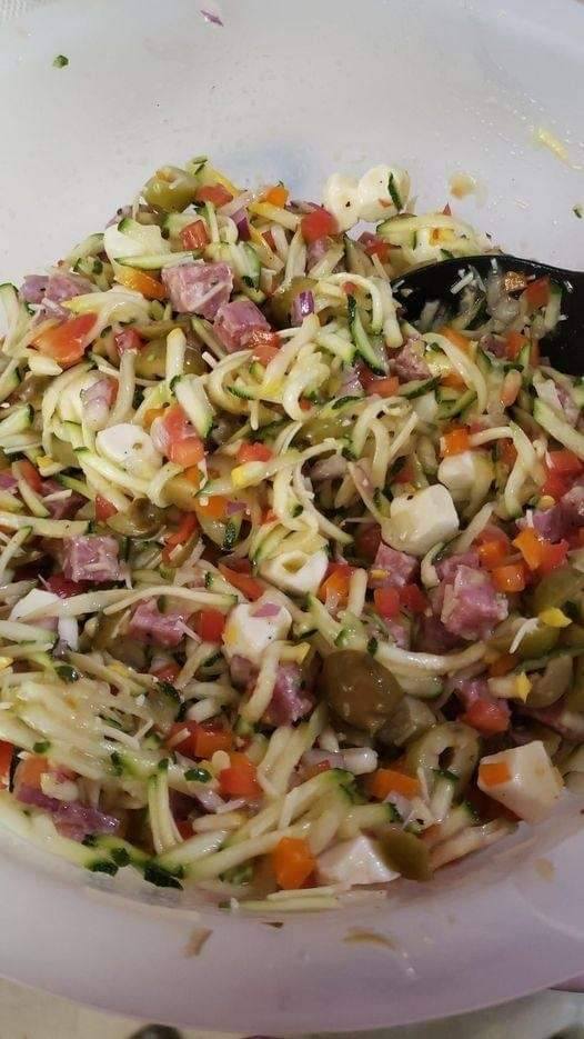 Toss in the sliced olives, strips of turkey or chicken salami, mozzarella pearls, and shredded Parmesan cheese. Mix everything gently until well combined.