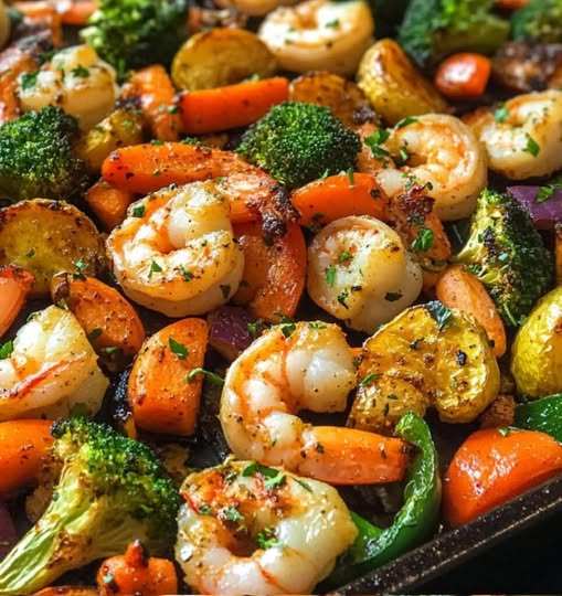 - Arrange the shrimp and vegetables in a single layer on a baking sheet lined with parchment paper.