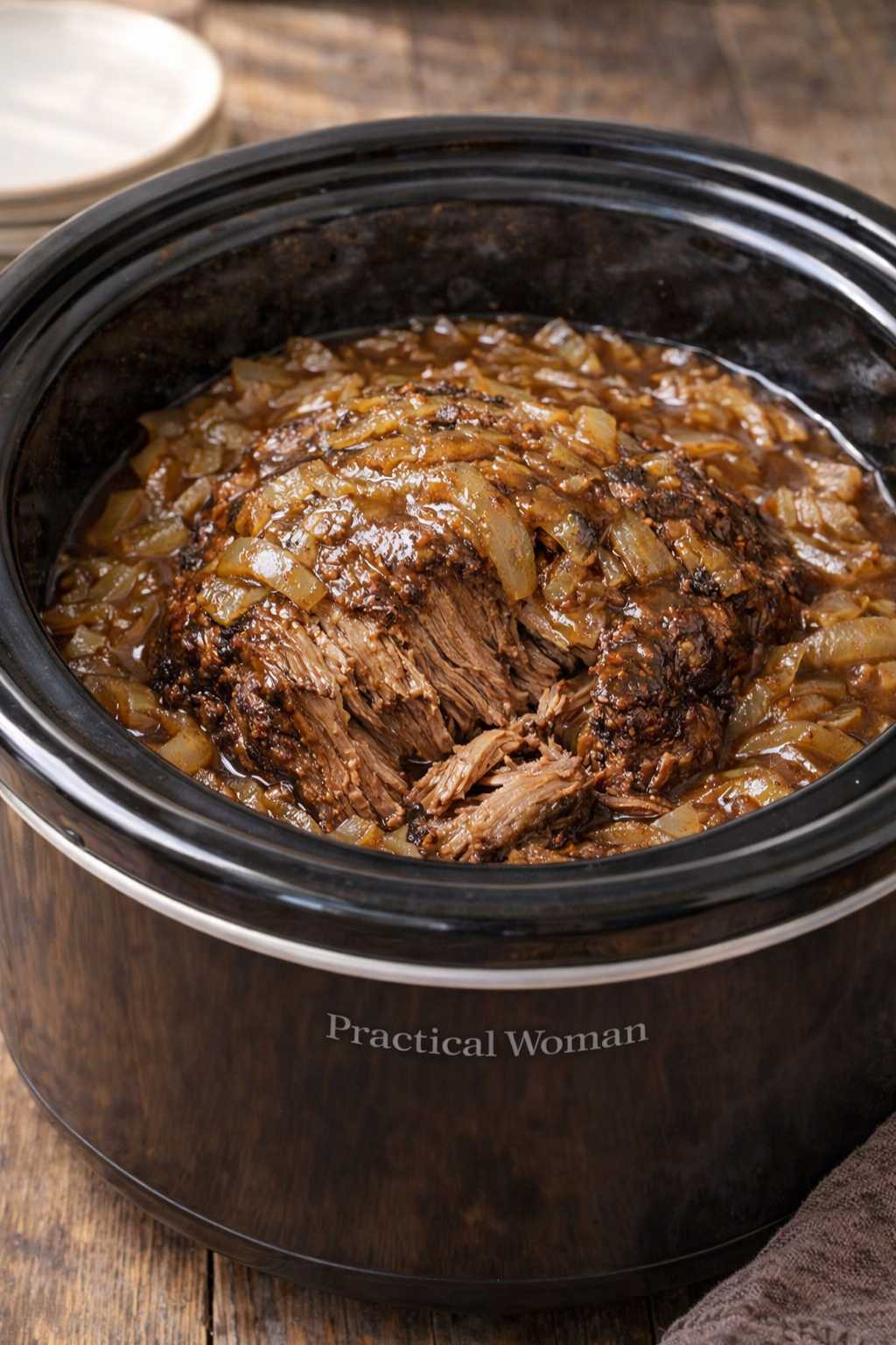 Use two forks to pull the roast into large chunks directly in the slow cooker and stir gently to coat with the onion gravy.