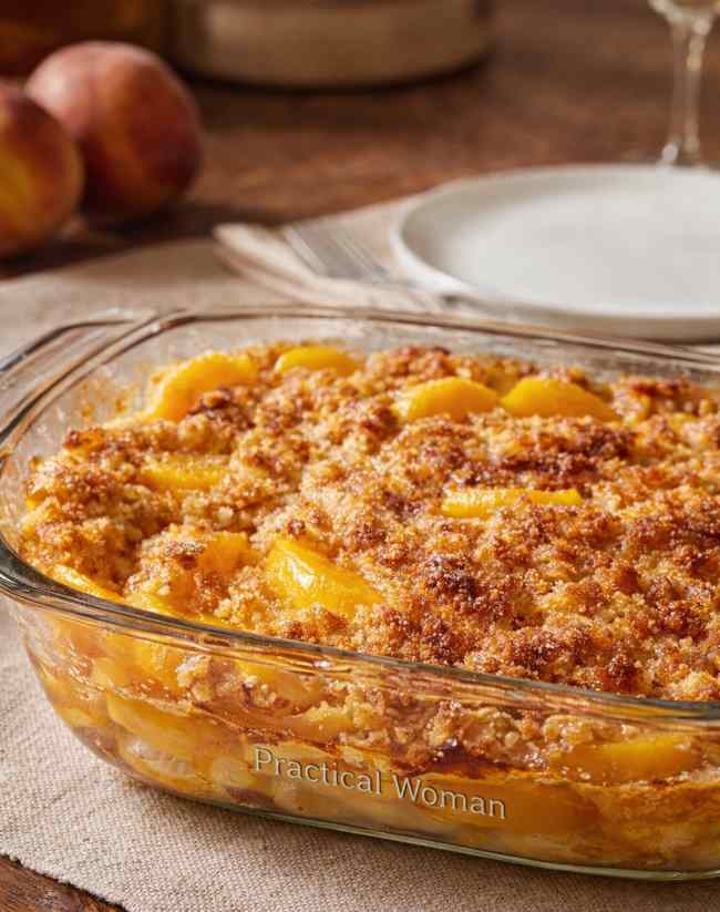 Pour the sliced peaches with all of the juice into the prepared casserole dish and spread into an even layer.