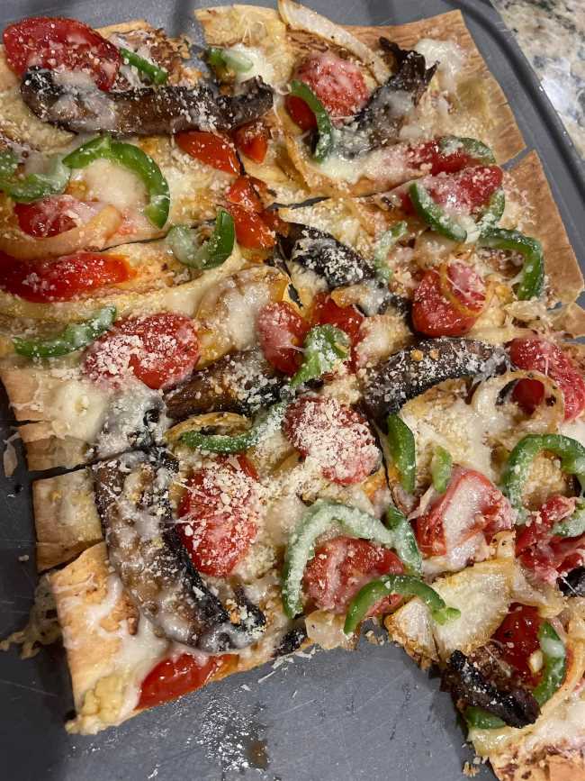 I sautéed mushrooms onions and grape tomatoes. Before adding the veggies I sprayed the wrap with olive oil and placed in the oven for 7 min on 375 to crisp up the flatbread.