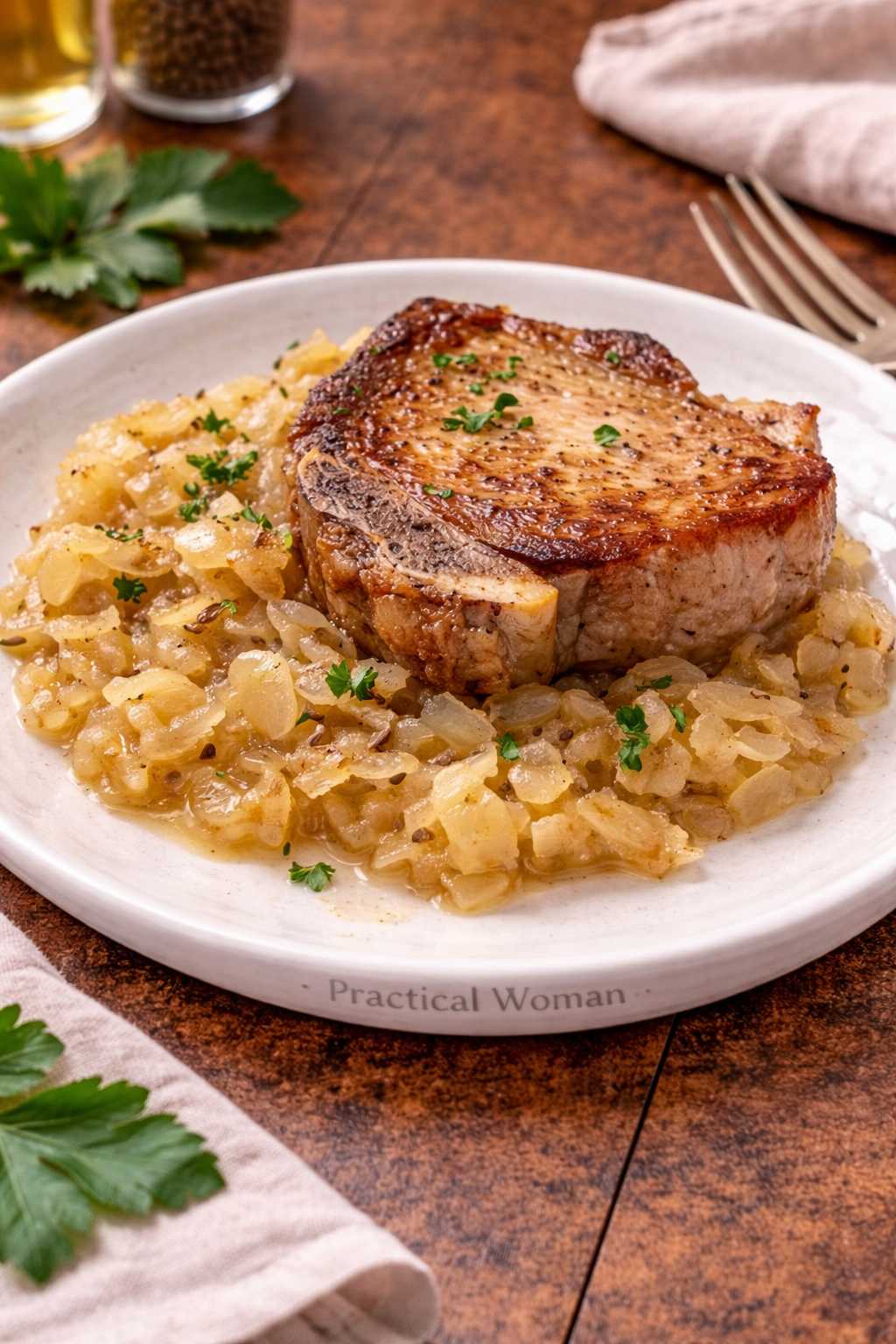 Season pork chops with salt and pepper and brown for 3–4 minutes per side.