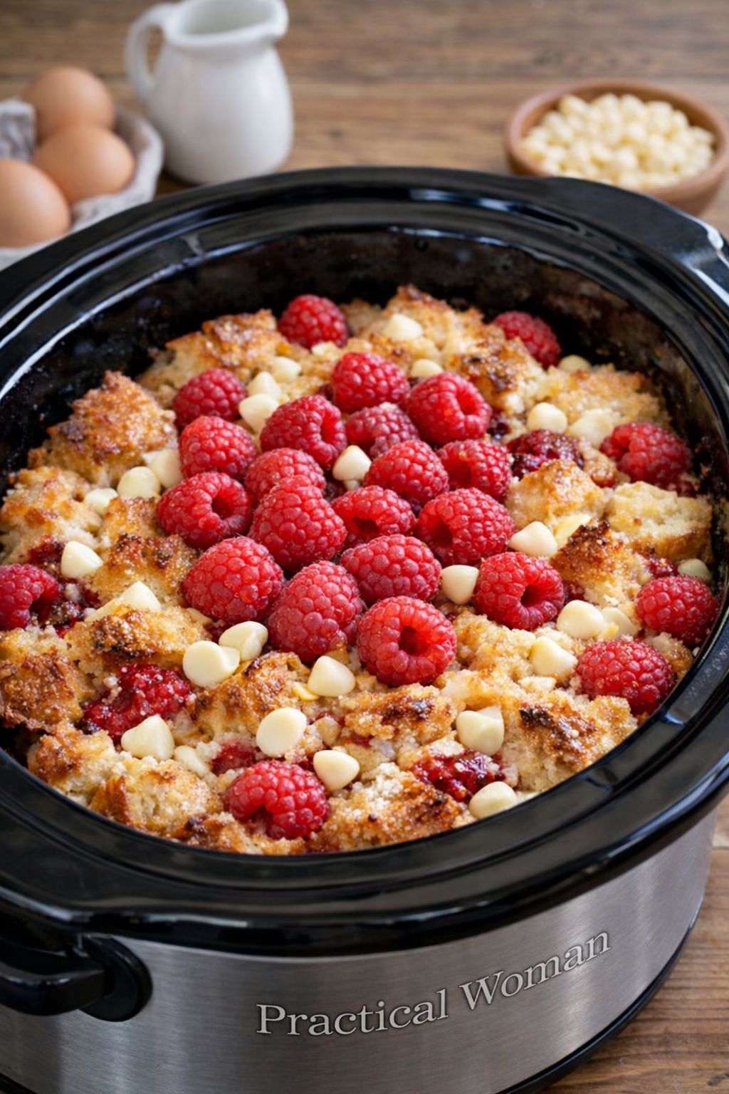 Add the cubed bread to the slow cooker in an even layer. Sprinkle raspberries evenly throughout, tucking some between the cubes.