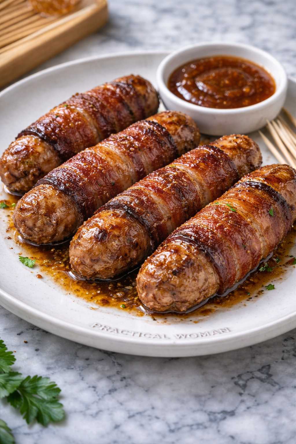 Servings: 12 servings (4 bacon wrapped bangers per serving, about 5 oz per serving)
