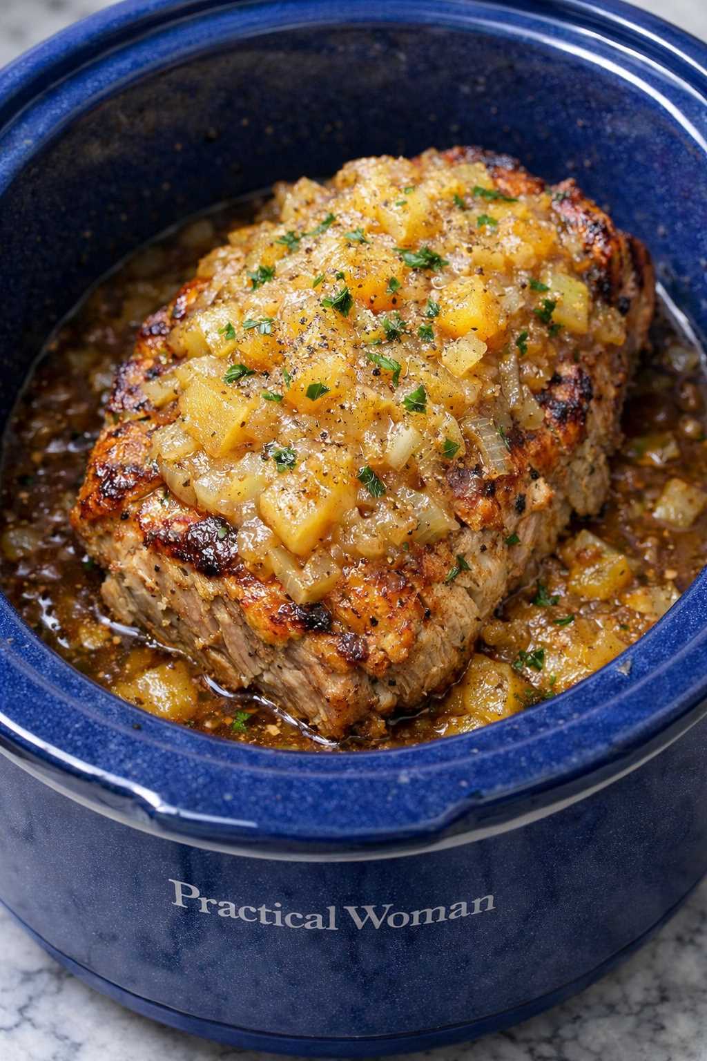 Tender slices coated in naturally sweet apple-onion sauce create a beautifully balanced main dish. The slow cooking brings deep flavor and fork-tender texture, making it perfect for a cozy family dinner.