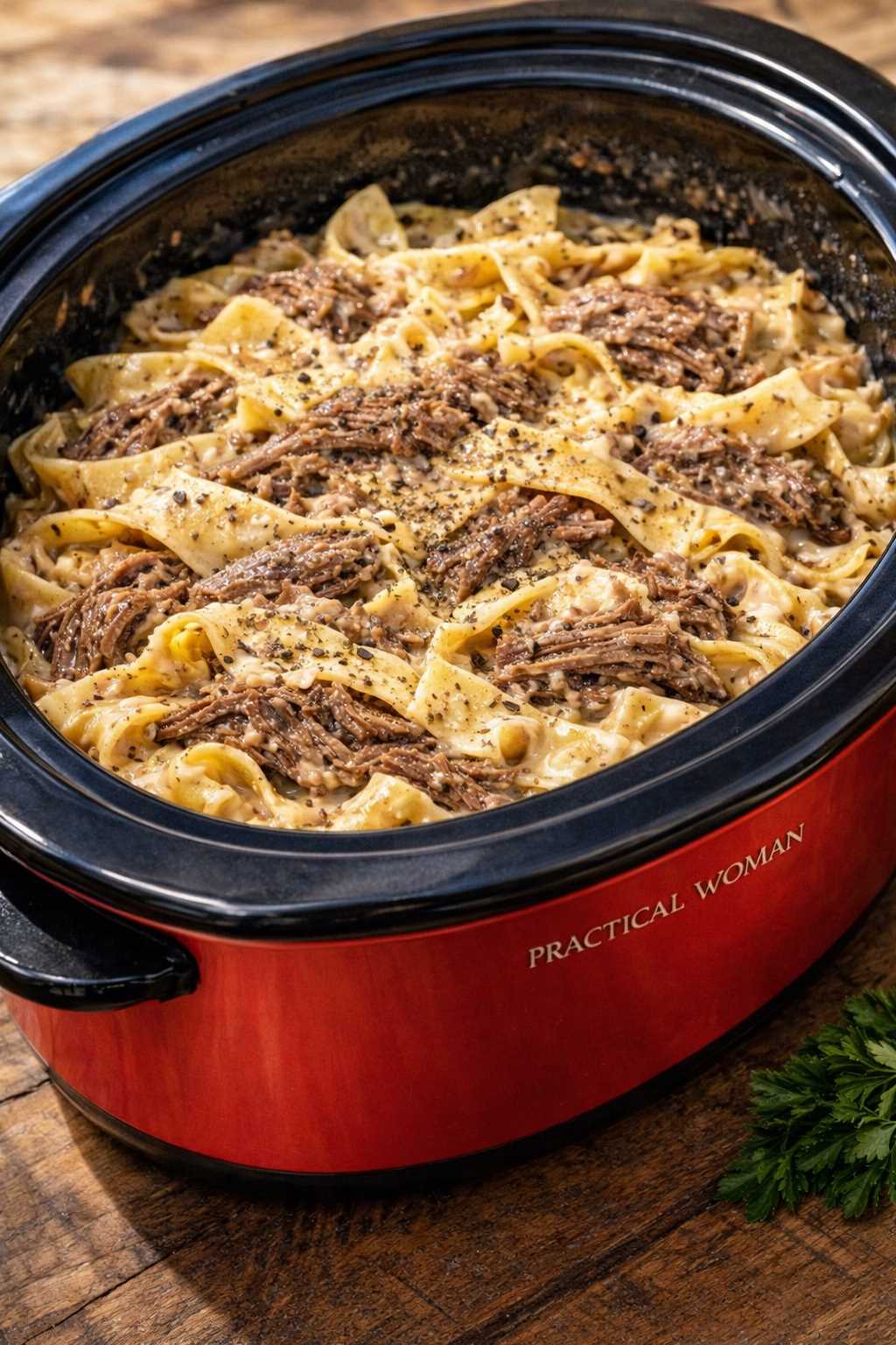 Cover and cook on LOW for 3 hours, until the noodles are tender and the liquid is absorbed into a creamy sauce.