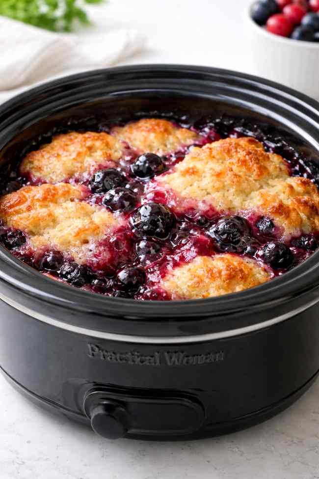 Cover and cook on HIGH for 2 hours 15 minutes, or on LOW for 3 hours 30 minutes, until the topping is fully set and the berries are bubbling at the edges.