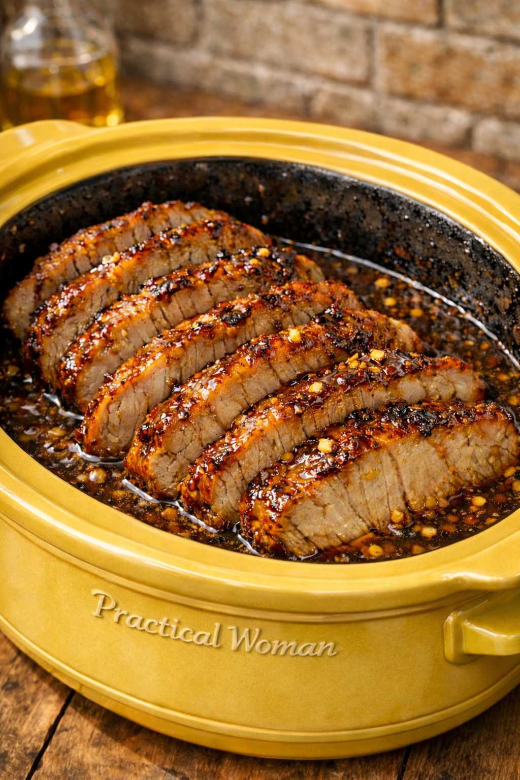 Slice the pork into 1/2-inch slices and return the slices to the slow cooker to coat them with the sauce before serving.