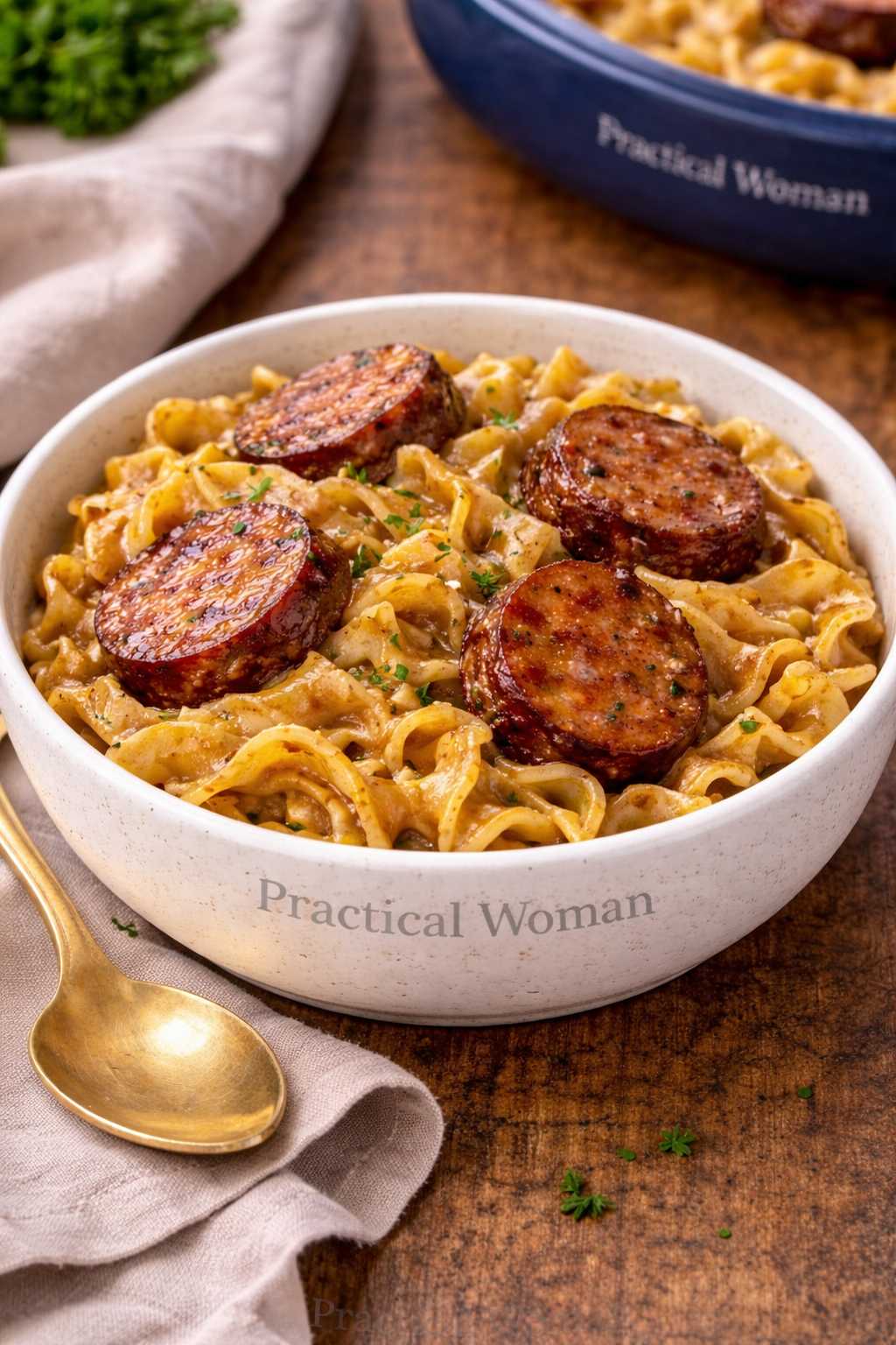 Lightly coat a 4–6 quart slow cooker with nonstick spray and add sausage.