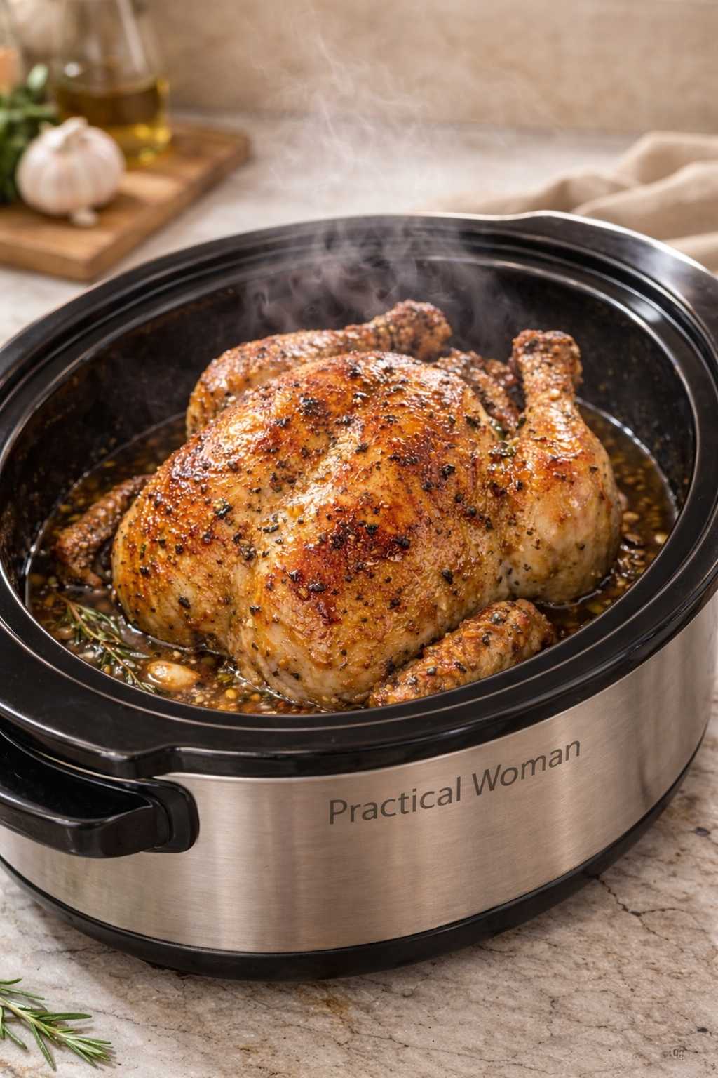 Place the chicken breast-side up in a 6-quart slow cooker with no added liquid.