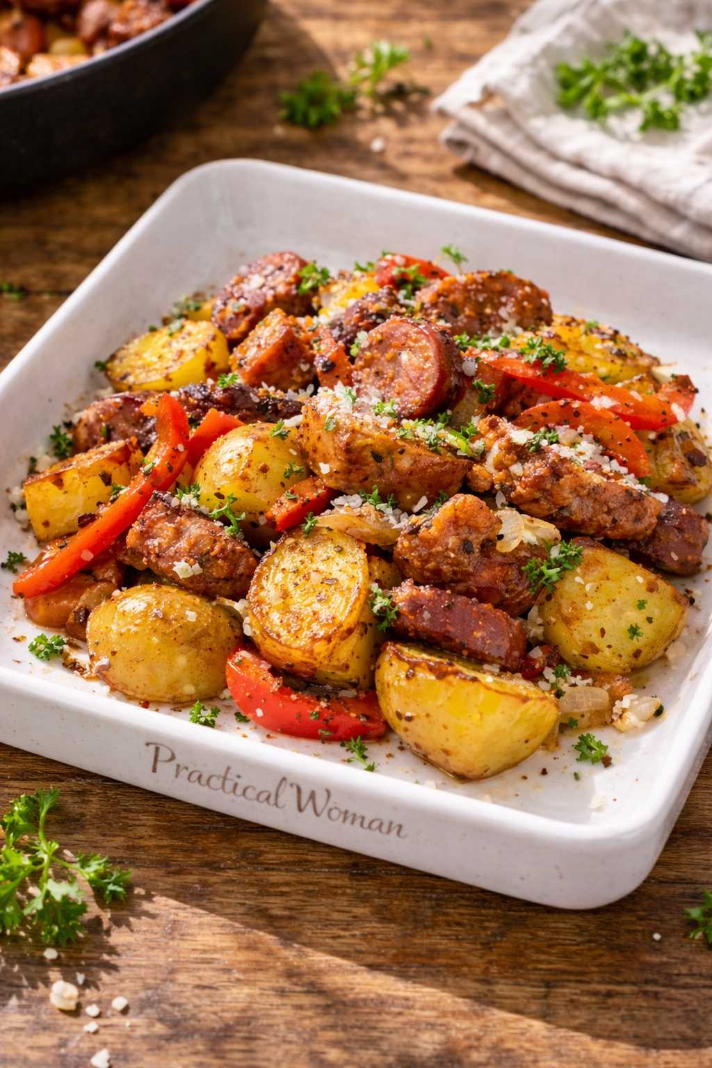 Add the potatoes with salt and pepper and sauté for 10 minutes until golden brown.