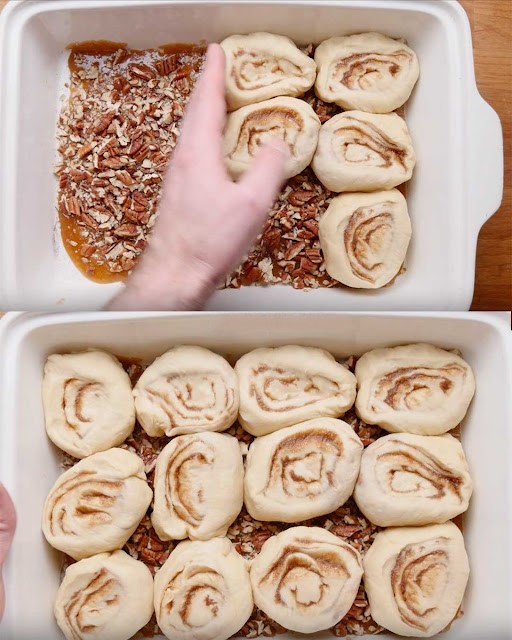 Place the buns atop the topping in the baking dish, cover, and let rise for about 45 minutes.