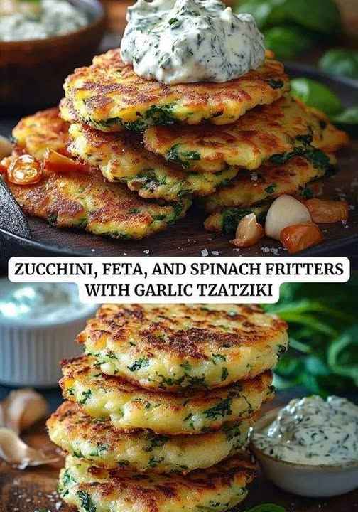 Zucchini, Feta, and Spinach Fritters with Garlic Tzatziki Directions:
